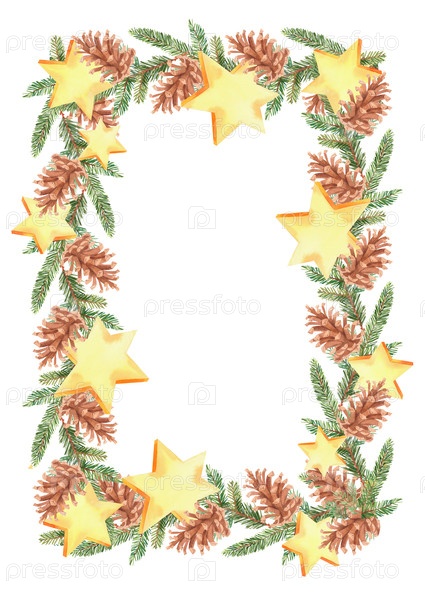 Вертикальная рама с водяными красками от ветвей пихты, ели шишки и звезды. для ткани, обоев, упаковочной бумаги, поздравительных открыток, дизайна, декора и иллюстрации