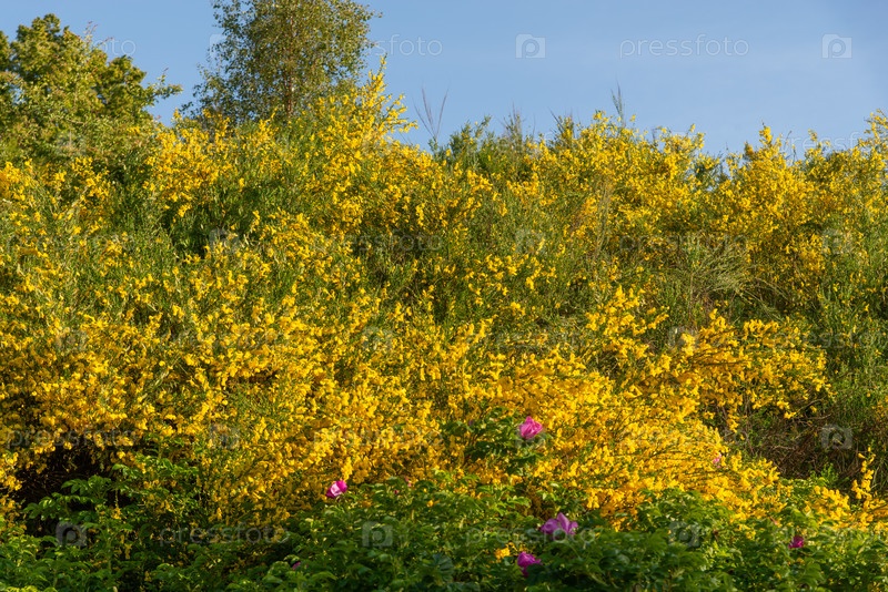 Ярко-желтые цветы моллюсков, покрывающие склоны холма рассеянными розовыми розетками, зеленой лиственницей и чистым голубым небом