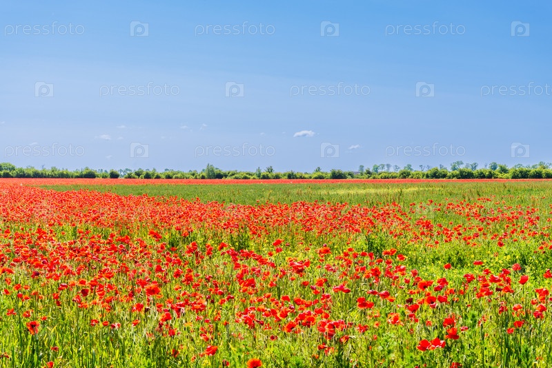 Бесконечное поле красных цветов мака под ярко-синим небом, идиллический летний пейзаж с яркими цветами и пышной зеленой лиственницей