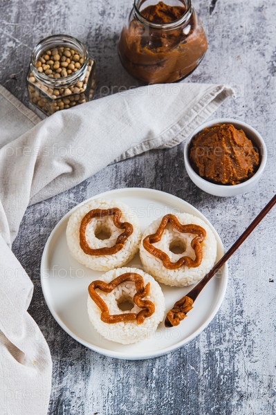 Вкусные мисо рисовые пончики на тарелке на столе с вертикальным видом