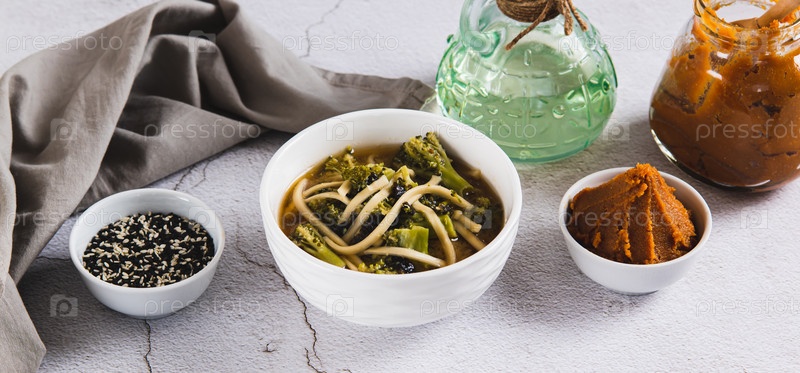 Вкусный суп из мисо с лапшой и брокколи в таре на столе WEB баннер