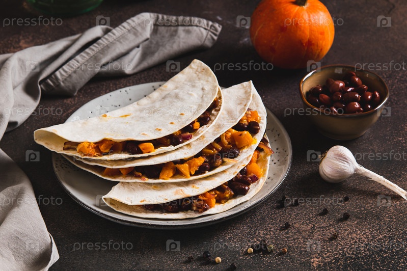 Пикантные овощные тако с бобами и тыквой на тарелке за столом