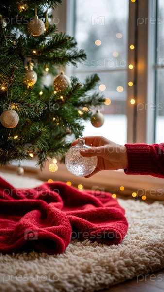 Прозрачный новогодний рождественский мяч в руке на фоне элегантной елки