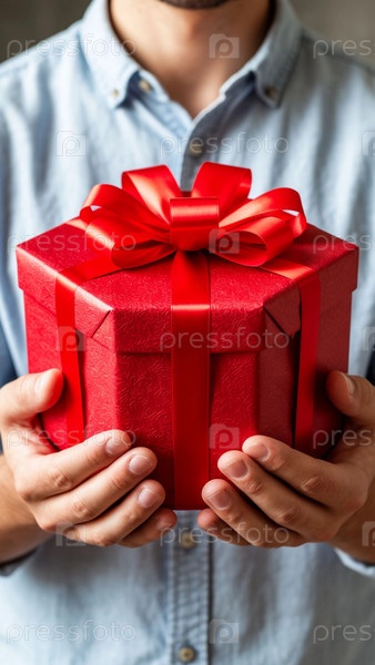 Прекрасный подарок в праздничной упакованной коробке в руках мужчины