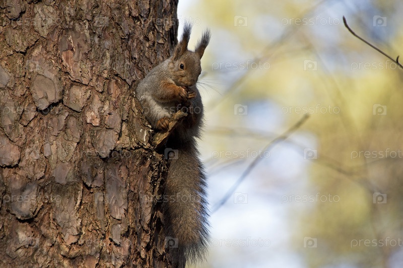 Красная белка сидит на дереве