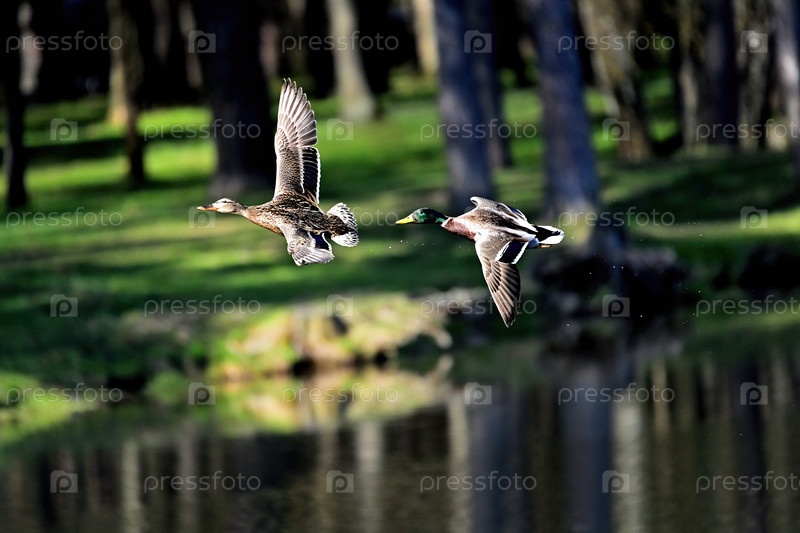 Утки летают над озером