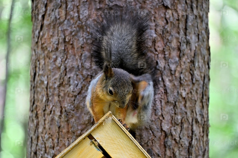 Березовая белка на птичьем кормилице царапает ухо