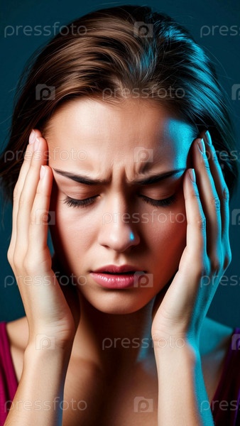 Сильная головная боль у молодой женщины, пытающейся успокоить свои руки держась за виски