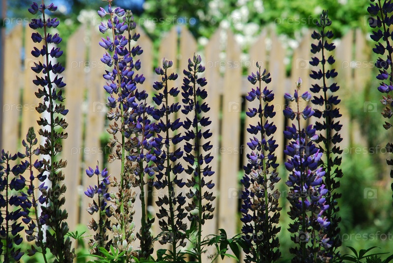 фиолетовые цветы под солнцем. волчьи бобы растут в скоплениях одних и тех же цветов. на одном стебле есть много соцветий в форме лодки. они имеют ярко-фиолетовый цвет
