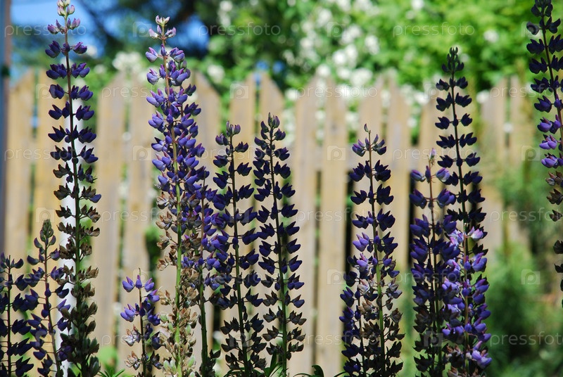 фиолетовые цветы под солнцем. волчьи бобы растут в скоплениях одних и тех же цветов. на одном стебле есть много соцветий в форме лодки. они имеют ярко-фиолетовый цвет