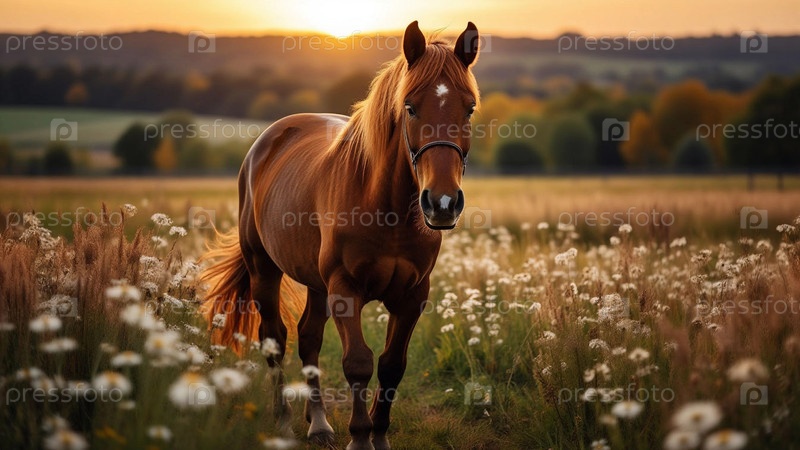 Лошадь гуляет по лугу на закате, вокруг холмов, цветов, кустарников и деревьев