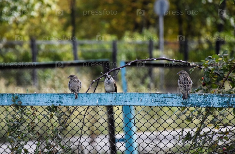 Три Воробья сидят на зеленом фоне