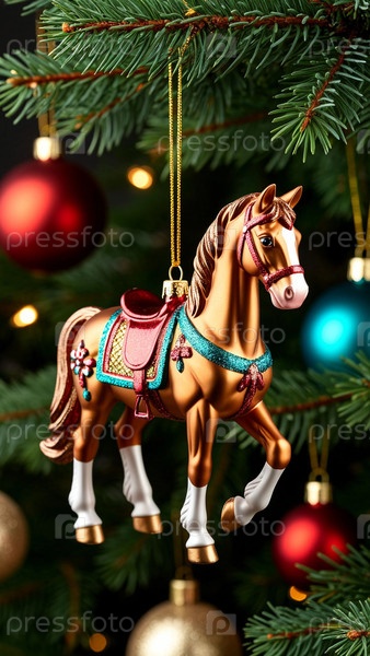 Лошадь в виде рождественской елки-игрушки висит на дереве