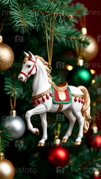 Белый коня Рождественская игрушка висит на ветке елей