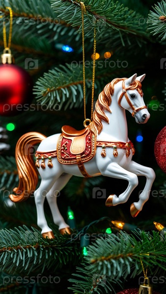 Стеклянный конь на праздничной ветке елей
