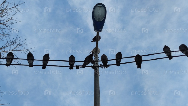 Голуби на проводах. Несколько городских птиц сидят на толстом электрическом проводе, привязанном между лампочками. Черные и серые птицы смотрят в разных направлениях, небо голубое сверху с маленькими белыми облаками