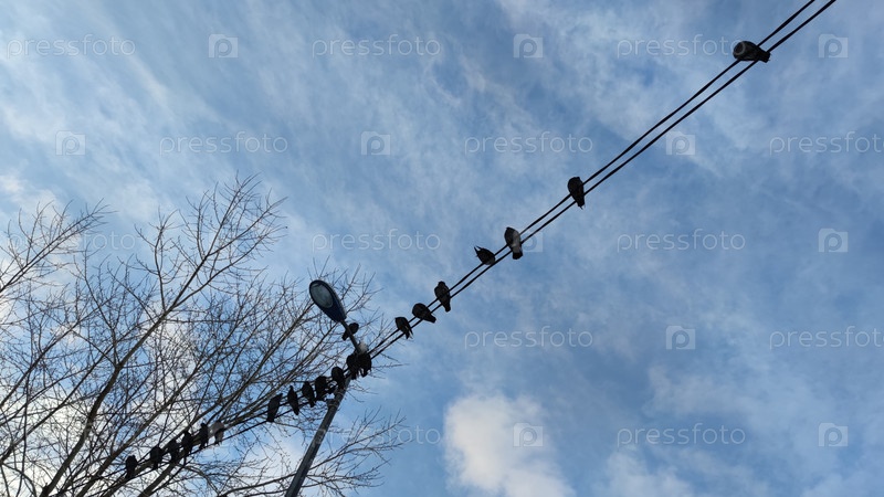 Голуби на проводах. Несколько городских птиц сидят на толстом электрическом проводе, привязанном между лампочками. Черные и серые птицы смотрят в разных направлениях, небо голубое сверху с маленькими белыми облаками