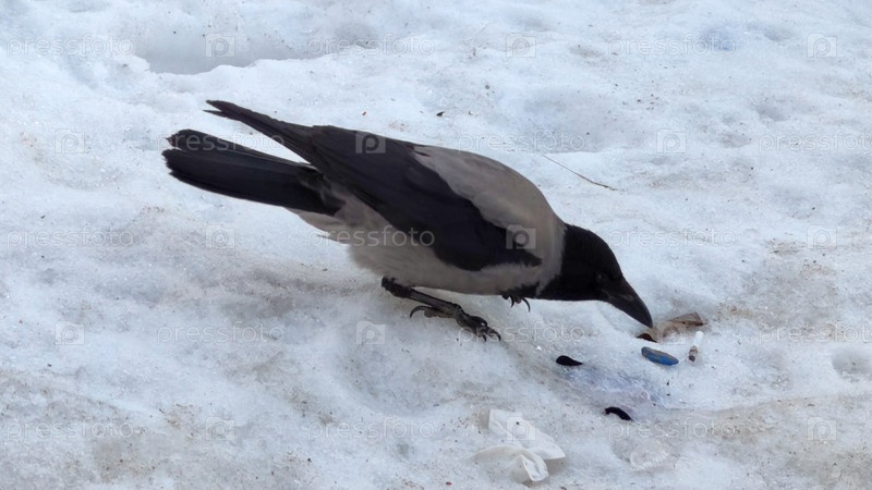 Серовато-чёрная ворона в снегу. Зимой белый снег покрывает землю. Большая взрослая птица сидит на снегу. Она ищет пищу в тающем снеге. У нее длинные когти на ногах