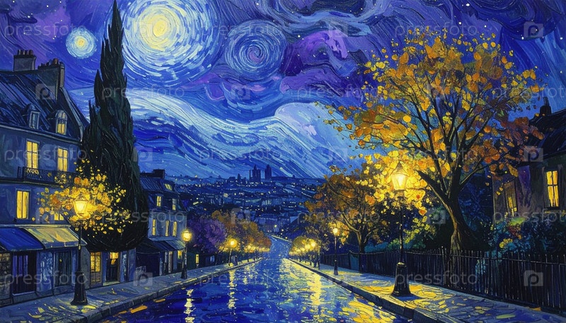 Звездная ночная улица с ярким городским вечером с отражениями на мокрой тротуаре, символизирующей искусство, ностальгию и мечтательный побег