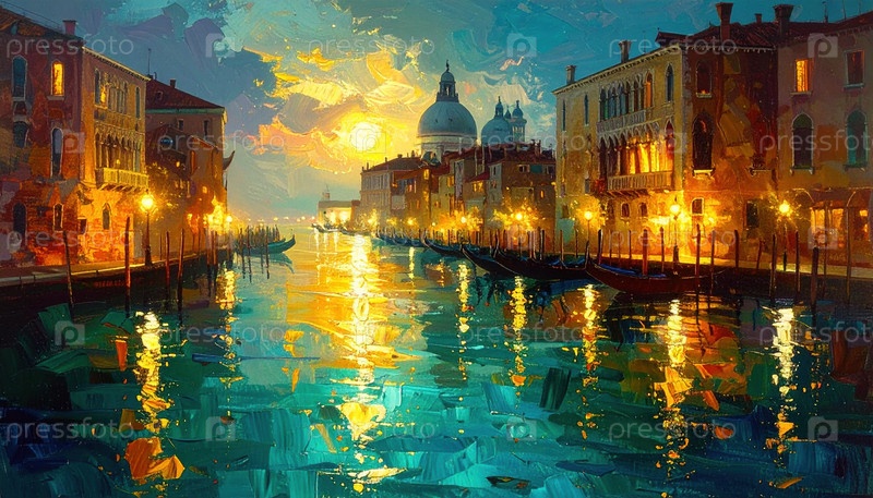 Импрессионистический взгляд на Великий Венецианский канал при закате солнца с отражением золотых огней и гондёл, вызывающих романтику, путешественное вдохновение и вневременное художественное наследие Италии