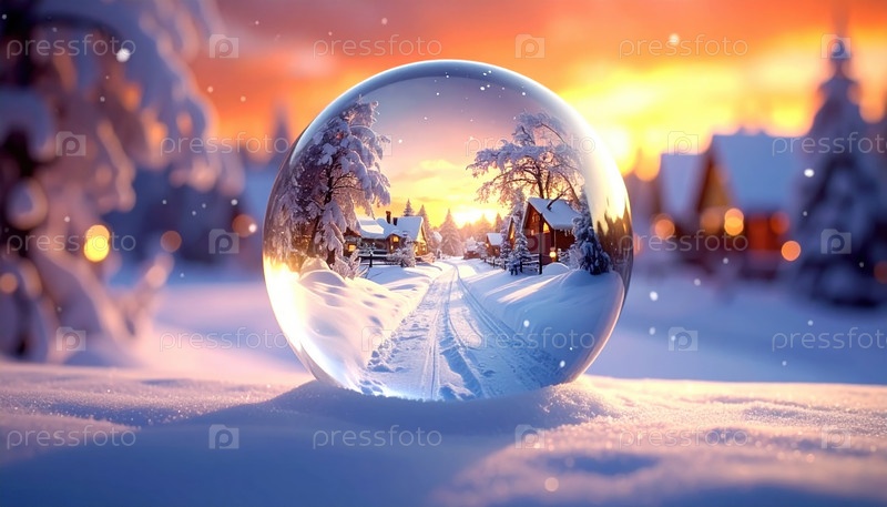 Снежная деревня на закате солнца отражается в кристаллическом шаре, символизирующем дух праздника, вдохновение путешествовать по зимней стране чудес и очарование праздничного сезона