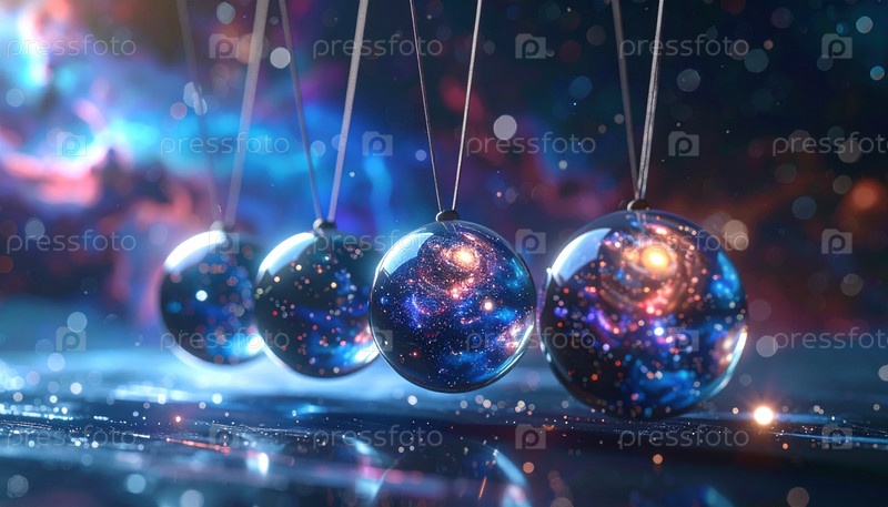 Галактики, отражающиеся внутри колыбельных Ньютона, символизируют космический баланс, науку, энергию и взаимосвязанное движение Вселенной
