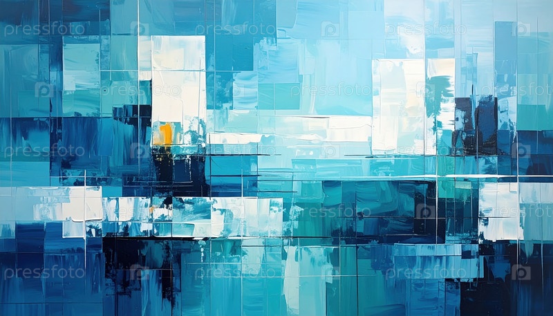Абстрактное геометрическое искусство в оттенках синего и белого напоминает о цифровых сетях, футуристической архитектуре и сложности данных в сегодняшнем взаимосвязанном мире