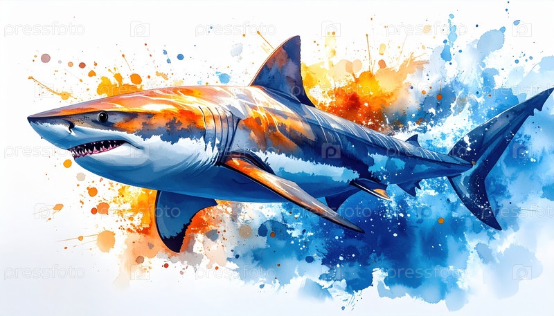 Акулы в стиле акварели с пятнами синего и оранжевого цветов, символизирующие сохранение дикой природы и художественную энергию морской жизни