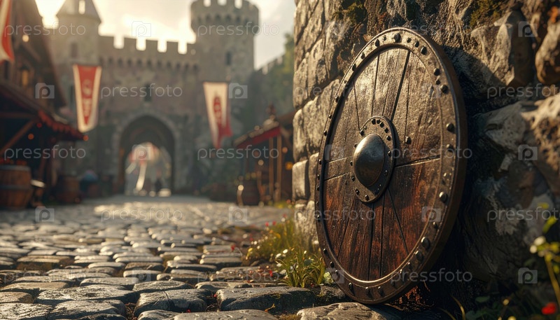 Деревянный щит, опирающийся на каменную стену в средневековой уличной сцене со вратами замка на заднем плане, символизируя историческое наследие и вечную защиту