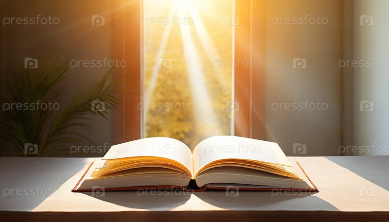 Открытая книга, освещенная золотым солнечным светом через окно, символизирующая знания, мудрость, веру или вдохновение во время духовного или рефлексивного момента