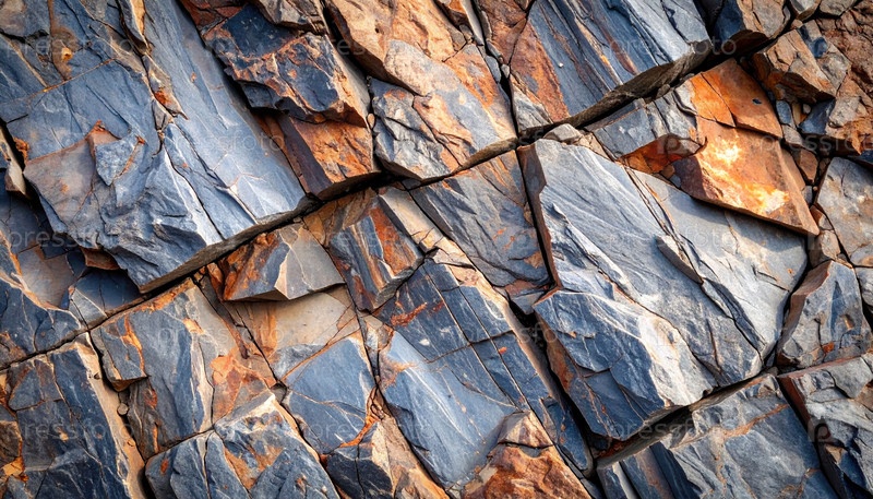 Разбитая текстурированная поверхность скалы с оранжевыми и синими тонами показывает стабильность земли, геологическое время, естественную красоту и узоры, символизирующие силу и трансформацию