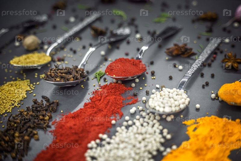 Коллекция специй разбросана по столу, среди них тмин, паприка и куркума