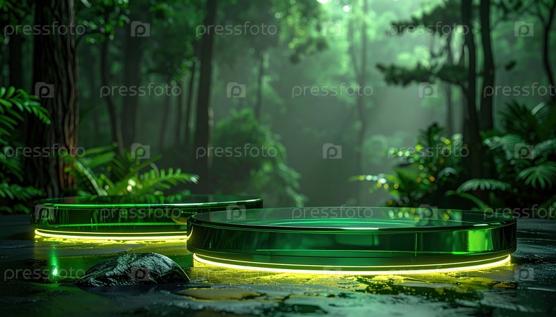 Футуристические подиумы из зеленого стекла в пышной среде тропических лесов, символизирующие гармонию между технологией устойчивости природы и экологически чистыми инновационными тенденциями