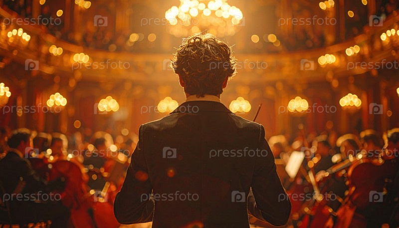 Дирижер, ведущий оркестр под золотыми огнями, символизирующий творчество, лидерство, гармонию, исполнение и бесконечное влияние музыки на культуру и эмоции