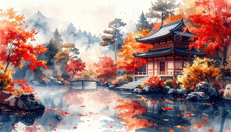 Осеннее утро в японском храме, окруженном красными и оранжевыми деревьями, отражающимися в спокойной воде, символизирующей мир, внимательность и красоту сезонных изменений