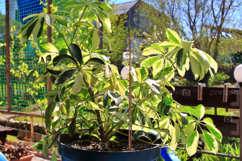 Цветок Cheffleur в горшке на фоне летнего домика с подсветкой