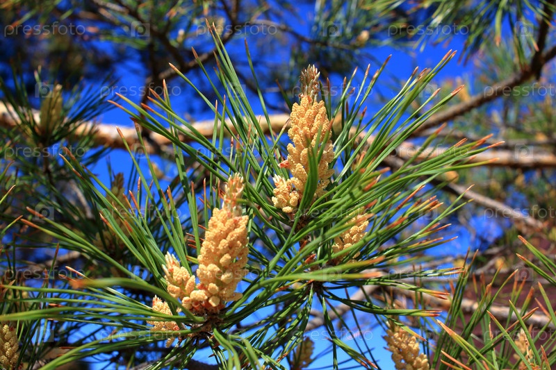 Молодые мужские шишки обыкновенной сосны (Pinus sylvestris) в период пыли. сосны на фоне голубого неба