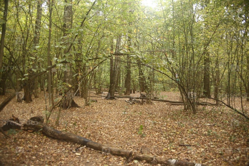 Древесные ветви с зелеными и желтыми листьями в лесу осенью