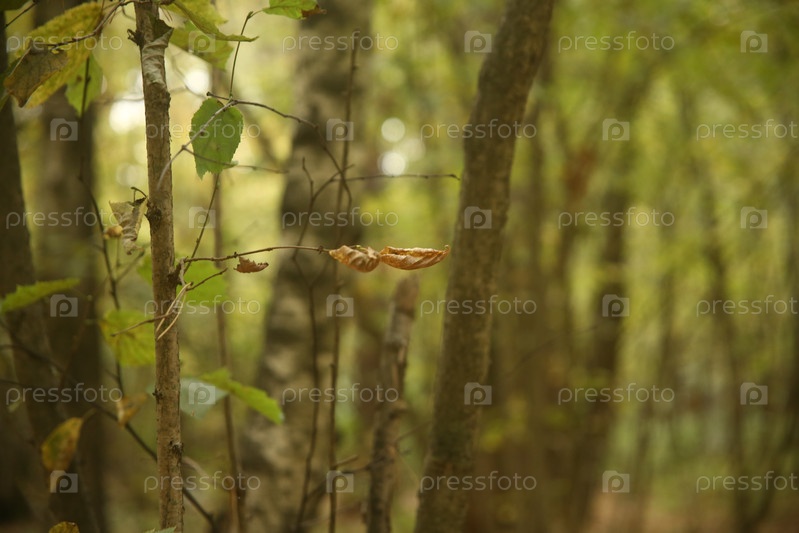 Древесные ветви с зелеными и желтыми листьями в лесу