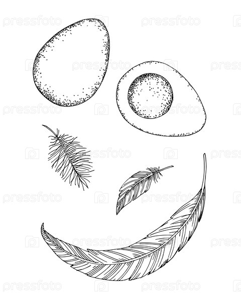 Перья и яйца. Ручная иллюстрация в стиле векторного чернил. Для дизайна упаковки, карт, обложек, принтов, этикеток на продуктах и тканей