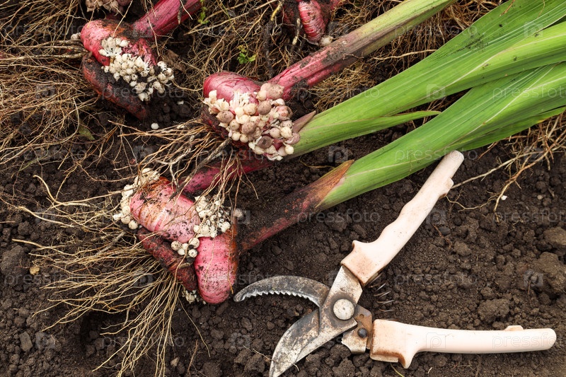 Раскопанные луковицы гладиоли и сектор инструмент для обрезки зеленых стеблей
