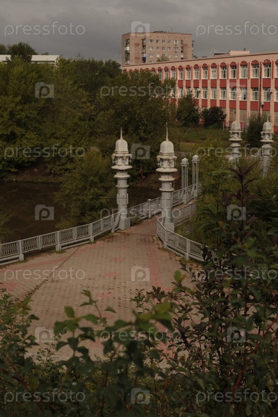 Пешеходный мост с декоративными башнями в городском парке Алметьевск