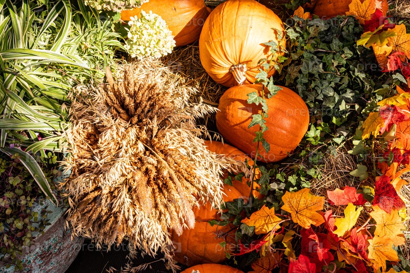 Шикарный осенний натюрморт с тыквами, кукурузными орехами, яркими листьями и ягодами. Вид сверху. Красивый осенний фон