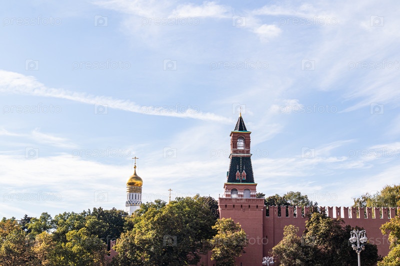 Москва, Россия. 2 октября 2025 г. Фрагмент кремлевской стены с будильником. Башня с колоколом предупреждает жителей о пожарах и других бедствиях