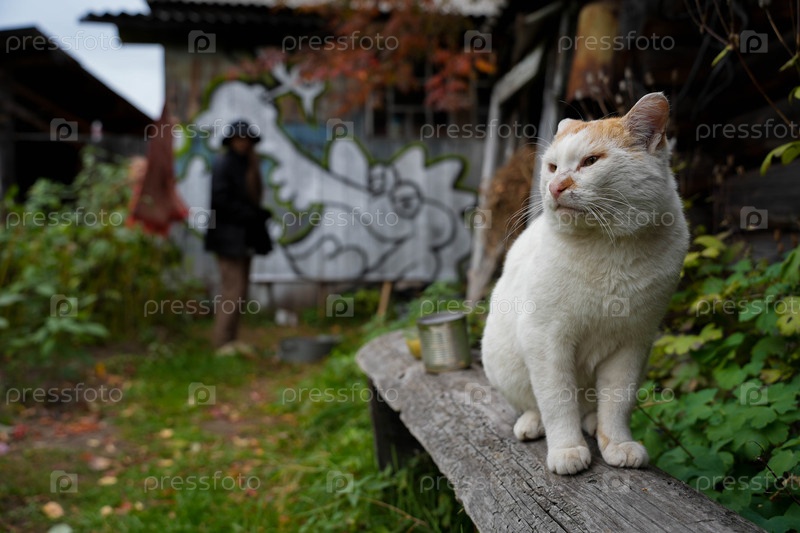 Кошка на сельской скамейке
