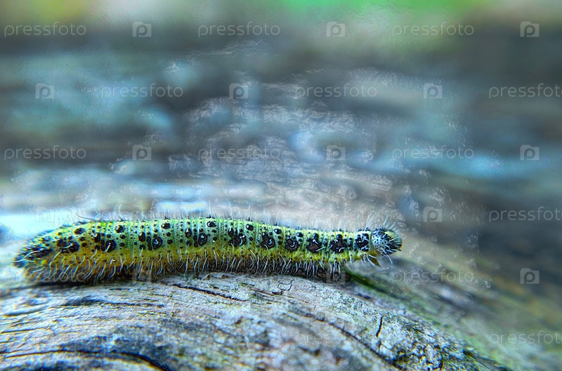Волосатая зеленая гусеница из капустного отбеливателя с черными пятнами медленно ползает по старому дереву