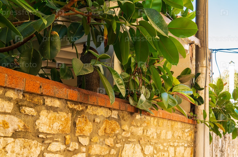 Большие листья фикуса эластика висят над каменной стеной.Старый город Бодрума, Турция