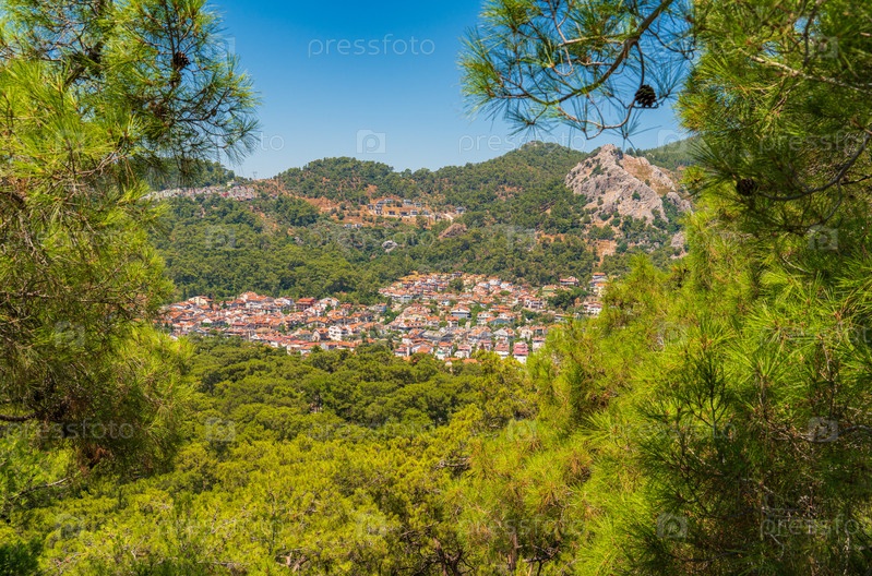Вид на дома на холме среди густозеленых деревьев.Marmaris View Point, Турция