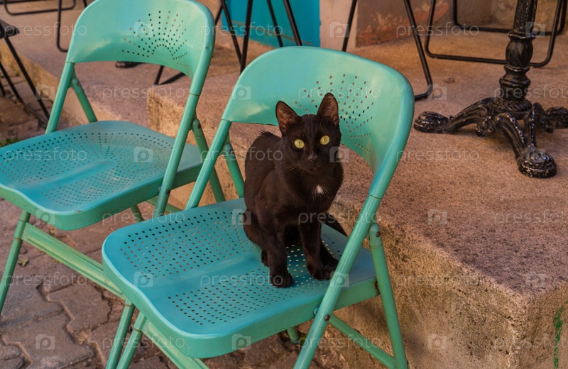 Любопытный черный кот сидит на бирюзовом стуле возле уличного кафе.Измир, Турция