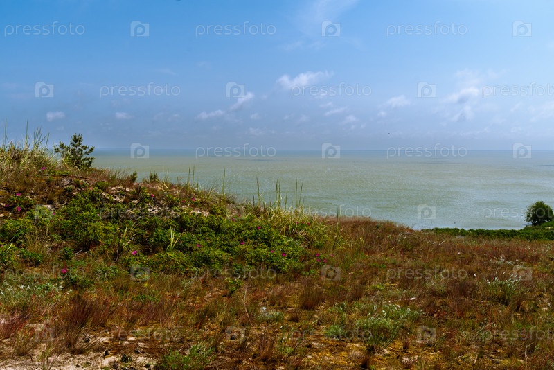 Прибрежный ландшафт с песчаными дюнами, выходящими на спокойное море под чистым голубым небом
